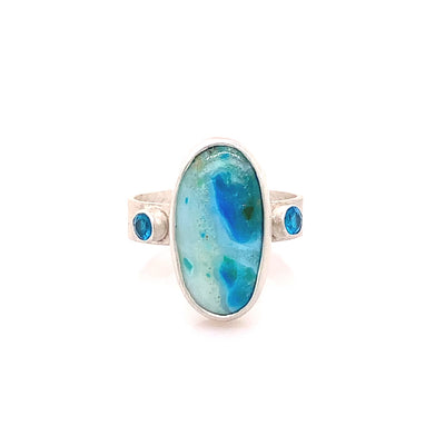 Unusual Natural Blue Opalina gemstone ring set with intense blue faceted neon apatite. All stones are natural. I cut this oval from Opalina that comes from Chile. It is a unique conglomeration of gem silica and Chrysacolla. The neon apatite is so intense and bright.