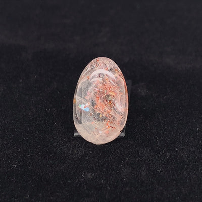 Beautiful clear sunstone with really bright inclusions of hematite which reflect green, pink, orange, and blue reflections. Great for a ring or pendant. Recommend an open back to allow light to pass through or to use a black background to make the colors pop.